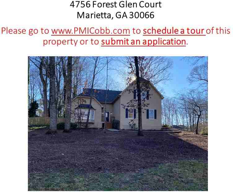 Newly refurbished 2,836 sq/ft home in the highly sought-after Lassiter School district! With a new roof, HardiePlank siding, ceiling fans, and exterior landscaping, this home features 4 spacious bedrooms and 2.5 bathrooms! The primary suite on the main level features hardwood floors, a walk-in closet, double vanity, a separate shower, and a whirlpool bathtub. In addition to the primary suite, the hardwood floored main level has an open family room, a separate dining room, a breakfast nook, and a kitchen. The kitchen includes a garbage disposal, dishwasher, stove with cooktop, microwave oven, and new refrigerator. Upstairs there are three additional spacious bedrooms with ample closet and storage space, and an additional spacious bathroom. The large deck and private, fenced backyard are the perfect space for outdoor activities and entertaining. Please visit PMI Cobb's website ( here ) to apply, schedule a self-access tour, or you can take a virtual tour of this home by clicking the following link . Self-access showings are available for applicants meeting prescreening qualifications.