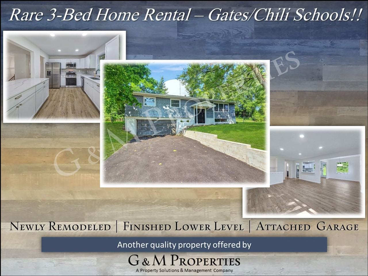 This is one you just can't miss! Take a look at this fantastic 3-bedroom home located in the Town of Chili. This one has been fully remodeled from top to bottom - everything is brand new! On the main level you have an open-concept living room, dining room and kitchen. There is a ton of cabinet and counter space in the kitchen, where you'll enjoy cooking while entertaining family and guests sitting at the breakfast bar and living room. There are large windows that flood the this main level with plenty of natural light. The bedrooms are spacious, with the primary having a walk-in closet and a private full bath. There is an additional full bathroom for the other two bedrooms to share. The lower level features an area for your shoes and jackets just off of the door leading to the garage. There is a large family room here, as well as a powder room and a laundry room. Here you'll find a brand new washer and dryer to use, included for your convenience. The spacious 2-car garage is perfect for keeping the snow of your vehicles during our great Rochester winters. Located on a quiet cul-de-sac, you can't beat this location. You're just minutes to Wegmans, Target, and other shopping and restaurants, as well as close to schools and parks. With 490 just around the corner, you have an easy commute to anywhere in the Rochester area. This is another fine property that is professionally managed by G & M Properties, giving you our best-in-class 5-star rated management services that includes our 24-hour, 1-call maintenance and online rent payment. Give us a call TODAY to check out this fantastic rental home, this one definitely won't last long. G&M Properties | (585) 568-7275 | www gmprop com Monthly Rent starting at $2,695.00. Please call for details. **All G&M Properties residents are enrolled in the Resident Benefits Package (RBP) for $30.95/month which includes renters insurance, credit building to help boost your credit score with timely rent payments, $1M Identity Protection, move-in concierge service making utility connection and home service setup a breeze during your move-in, our best-in-class resident rewards program, and much more! More details upon application.** ------------------------------------------------- **NO Smoking** **Credit Check / Background Check Required**