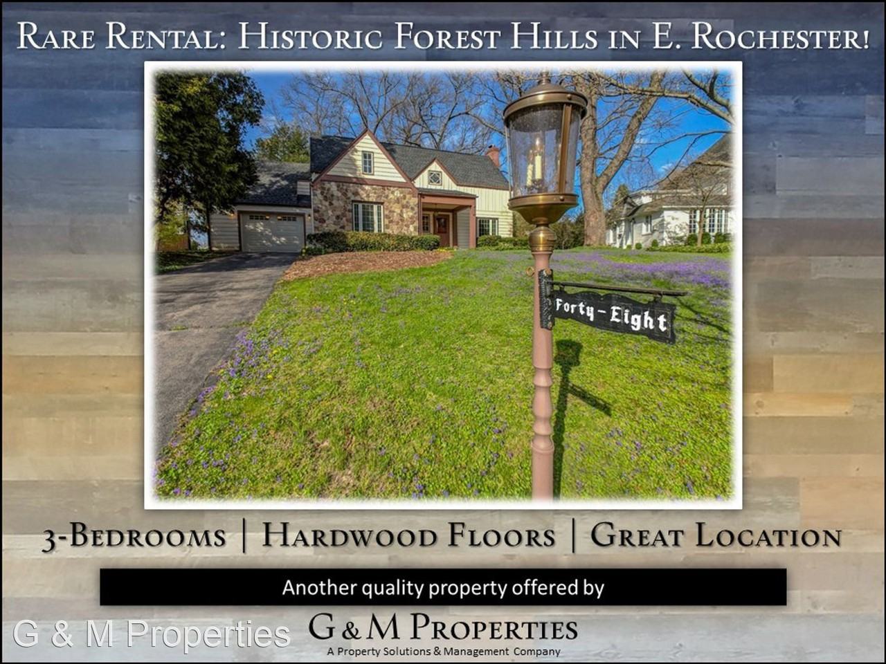 Beautiful House in the Historic Forest Hills Neighborhood - Gorgeous 3-bedroom house located in the highly sought after, rarely available Forest Hills neighborhood. This neighborhood reflects the past encompassing design trends of residential neighborhoods from the 1930's. The history of the house speaks for itself when you walk through. Beautiful hardwood floors, open rooms with gorgeous windows to let in not only light but a view of the lovely wooded community and landscaping in the backyard. The large living room has a cozy fireplace for the tenant's use and is connected to the formal dining room. Perfect for entertaining and walking out into the backyard. The kitchen is updated with new appliances, and connects to a mudroom with first floor laundry for your convenience. Attached you will find a one car garage, perfect for keeping snow off your car in the winter. Entire exterior painting scheduled for this June as well! This house is close to everything: Wegmans, St. John Fisher and Nazareth colleges, 490, Fairport, Pittsford and many stores and restaurants. This is another fine property that is professionally managed by G & M Properties. You'll love living in your own single-family home, and still have all the benefits of apartment living like 24-hour, 1-call maintenance and online rent payment. Call TODAY to schedule your walk-through of this great home! G&M Properties | (585) 568-7275 | www gmprop com Monthly Rent starting at $2,250. Please call for details. ------------------------------------------------- **No Pets** **No Smoking** **Credit Check / Background Check Required** No Pets Allowed