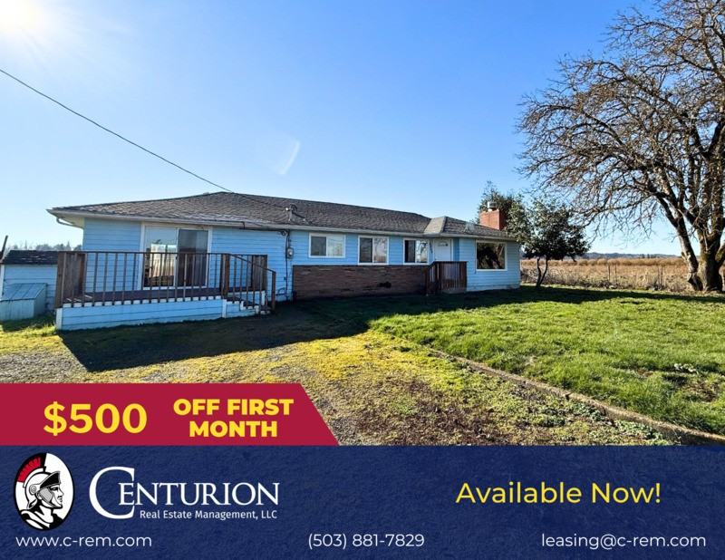 TERMS: * Rent: $2,295 + $50 RPB = $2,345/mo * Deposit: $2,200 (On Approved Credit) * Application Fee: $68/per adult 18+ * Tenancy: 1 Year Lease * Heat Type: Electric * Note: Non-Smoking Property PET POLICY: * NO PETS * All applicants must complete the Screening Process (https://crem.petscreening.com) UTILITIES: * Included: NONE * Tenant is Responsible for All Utilities AMENITIES: * Refrigerator * Stove/Oven * Central Heating & Air Conditioning 1 STORY HOUSE: * Only Fenced Area of the Property Included * All Barns/Sheds As Is LAUNDRY: * Washer & Dryer Hook-Ups WATER TYPE: * Well SEWAGE TYPE: * Septic LANDSCAPING: * Tenant Responsibility PARKING: * Driveway All Centurion Real Estate Management, LLC residents are enrolled in the Resident Benefits Package (RBP) for $50/month which includes renters insurance, HVAC air filter delivery (for applicable properties), credit building to help boost your credit score with timely rent payments, $1M Identity Protection, move-in concierge service making utility connection and home service setup a breeze during your move-in, our best-in-class resident rewards program, and much more! More details upon application. 1. Move-in Special ONLY applies to the current month. (IF APPLICABLE) 2. The application process normally takes 1-3 business days. 3. Must see the property physically before the deposit is made. 4. If you have a pet, ESA or you don't have a pet you must register at https crem petscreening com 5. Apply to one property at a time. Pet Policy: Notice to all residents and applicants, everyone must complete the screening process. This is not only for pet and animal owners; it applies to residents and applicants who do not own pets. The pet policy includes caged animals and pets. Additional deposits and monthly pet rents will vary; keep in mind that it is subject to the approval of your petscreening. com profile. You will not be moved into the unit without this completed. Prices are subject to change, we do not guarantee prices, items change, and errors occur. If there is a discrepancy between a price online and a price in the office, supervising property manager shall have the final say. *Due to overwhelming demand we may be unable to respond to your rental inquiry.* INTERESTED IN THIS PROPERTY? • Properties are on a self-showing lockbox and each listing specifies how it is viewed. • Feel free to drive by the property to check it out. • Check out more photos on our website at www c-rem com • Apply directly to the unit on our website www c-rem com under the “available rentals” tab. "This information is deemed reliable, but not guaranteed." Centurion Real Estate Management, LLC 1365 Commercial St. SE Salem OR 97302 Web: www c-rem com