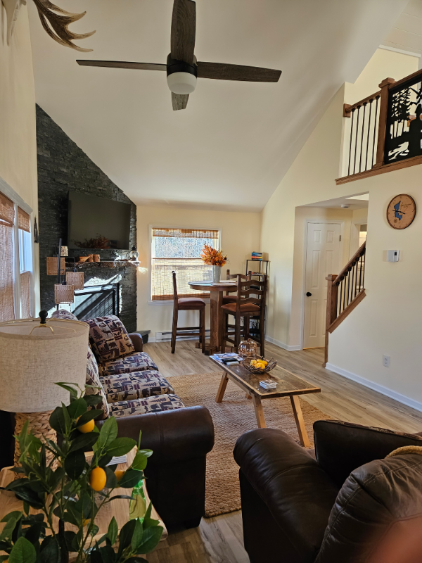 Property Id: 1813668 Newly renovated home (975 SF with 1.5 car garage) steps to Tinney's Tavern on Lake Desolation in the Town of Greenfield and the Saratoga Springs School District. Located 12 miles from downtown Saratoga Springs (Broadway). Saratoga Hospital, Skidmore College, SPAC, Saratoga Race track, Casino, Saratoga Lake, Sacandaga Lake are all about 20 minutes drive. A fully furnished house with brand new appliances, furniture, beds/bedding, blinds, etc. and front and side (off kitchen) decks for outdoor enjoyment. Outdoor gas firepit, gas grill, seating, flower gardens for your enjoyment. Safe and quiet location, easy access, easy to find. Fully stocked kitchen with full size dishwasher, refrigerator, water cooler, gas cooktop, Quartz countertop. Master bedroom with king bed and ensuite half bath. Loft bedroom with 2 full-size beds, great lighting, dresser. Full bathroom has heated floors, double sinks, washer and dryer and large walk in shower. Gas fireplace in Living area.