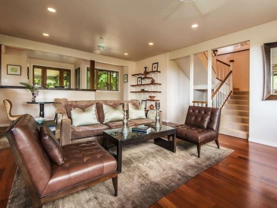 The North Shore of Kauai is the choice of the most discerning. This property is the perfect retreat by which to ensure your privacy and tranquility. It is located on 3.5 gated scenic acres with expansive mountain and water views. This 2 bedroom+ home has a private second floor king size master suite with hardwood floors and peak-a-boo ocean view, granite counter tops, jacuzzi bath and tiled shower; a second king size guest master on the main floor; a great room with hardwood floors and exclusive designer furnishings; gourmet kitchen, a screened lanai media/office, an outdoor shower with outdoor dining; miles of hiking/biking trails and minutes from the famed north shore beaches and restaurants, golf and many activities that make the North Shore of Kauai. Located in the sunbelt of Kalihiwai Ridge only minutes to the highway yet quiet and serene. The landscaping is stunning with fruit and palm trees and the colorful palette of Kauai flora and fauna evident everywhere including orchids tied to the palm trees, colorful bouganvilla , water pots with lotus and architectural sculptures and plant filled urns to tantalize the senses. Price includes yard service / excludes utilities and house keeping. Sorry no pets.