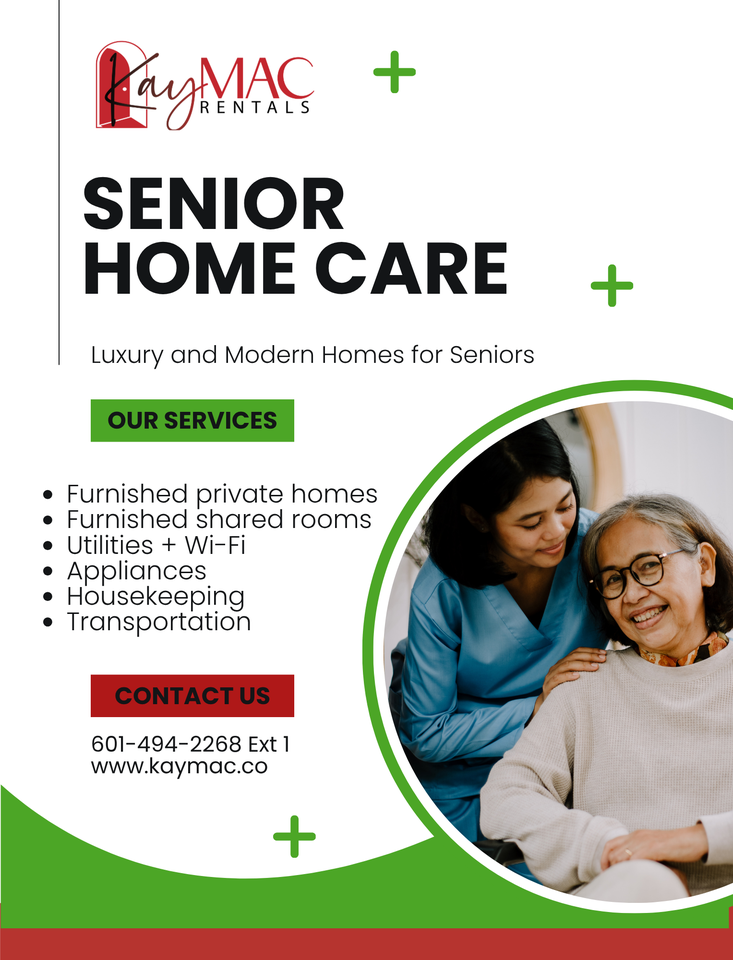 Now accepting seniors (55+) veterans, and independent individuals needing light assistance for private room rentals in a quiet, comfortable home designed for independent living with light supportive services. A safe, respectful environment that feels like home β not a nursing facility. π‘ PRIVATE ROOMS β Furnished or unfurnished options β Clean, quiet, and well-maintained β Peaceful shared home setting β¨ RENT INCLUDES β All utilities β High-speed Wi-Fi β Appliances β Housekeeping Services β Transportation assistance (appointments & errands) β Shared kitchen, living room & bathroom β Single-level living β no stairs * (Private Homes are also available starting at $1,350) π CONVENIENT LOCATION β Minutes from hospital & medical facilities β Close to shopping, groceries & pharmacies β Quiet, established neighborhood π LIMITED AVAILABILITY π© Contact us today to schedule a tour or learn more π§ **** π www kaymac co π 601-494-2268 ext. 1
