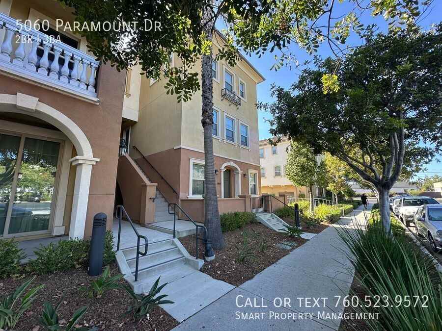 5060 Paramount Dr, San Diego, CA 92123 Town home 2 bedroom/ 2.5 bathroom/ Air Conditioning/ 1339 SF/ 2-Car Garage. Centrally located in the heart of San Diego. Easy access to all area in town. Down the street we have the restaurant district along Balboa Ave and Convoy area. To the south is the shopping district like Mission Valley, Fashion Valley and to the north is UTC areas. Great floor plan offers tons of storage spaces. Washer and dryer conveniently located on the 3rd floor. Both primary suites are good size and shape located also on 3rd floor.. Spacious 2 car garage (Tandem parking) Kitchen, dinning room and walk in pantry are on the 2nd floor. Great floor plan with inviting front porch to welcome all guest. Trash included in rent. For more information or to set up an appt to view the property please visit us at www SmartPMSD com or call: 760.523.9572 Thanks for your interest! This Property Proudly Managed By Smart Property Management