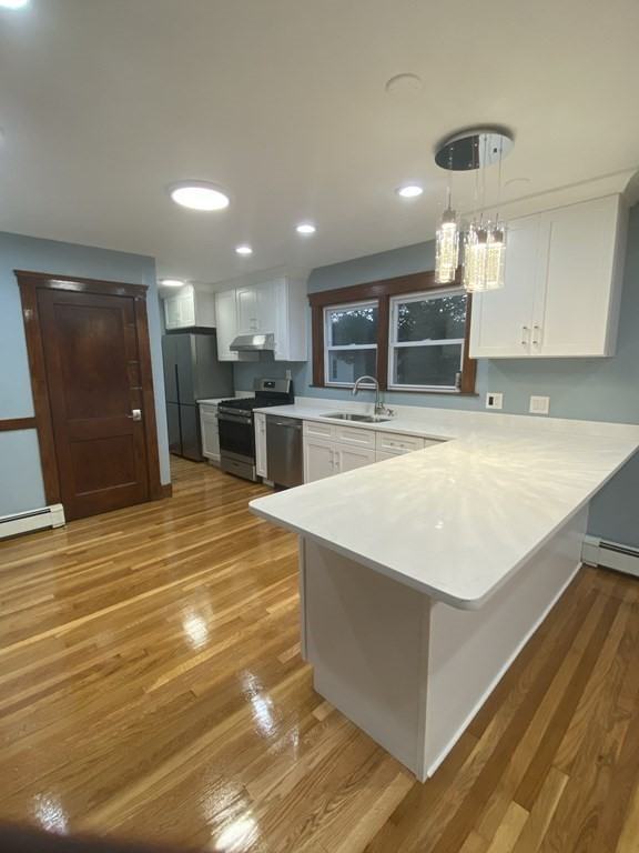 Available Now!!! Bright and sunny this recently remodeled apartment has it all. Open floor concept with gleaming hardwood floors throughout. Brand new kitchen with quartz countertops and high end appliances complemented by recessed lighting and chandelier. 3 generous sized bedrooms. Large living room with decorative fireplace. Seperate space for your office or reading. Coin operated laundry. 3 tandem parking spaces. Convenient location to Moody St, close to public transportation, restaurants and shops. A commuter’s dream with access to Rt. 20, Rt. 117, Mass Pike and Rt. 128. One Cat could be considered. No smoking please.