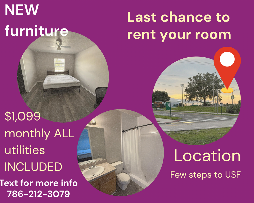 Room for Rent Shared bath each room: $ 900 month (utilities included) Suite (room + bath) $1,099 month (utilities included) Available from: ASAP House Fully NEW furnished (table, chair, sofa and TV stand) with High-speed Wi-Fi. šļø Room Features: ā Fully NEW furnished (bed, desk, chair, closet) ā Shared bathroom with another person ā Air conditioning / heating ā Quiet and safe environment š¢ Shared Amenities: āļø Kitchen access āļø Laundry (Washer and Dryer) on-site āļø Study/common area āļø Parking š¶āāļø Walking distance or easy public transport to: š USF (in front of Baseball Stadium) š Grocery stores, restaurants, and public transport nearby š Perfect for responsible and respectful student. No smoking, no pets. š© DM more photos, questions, or to schedule a visit! Welcome to your new home in Tampa, Florida! This delightful rental property is situated in a vibrant neighborhood, offering...