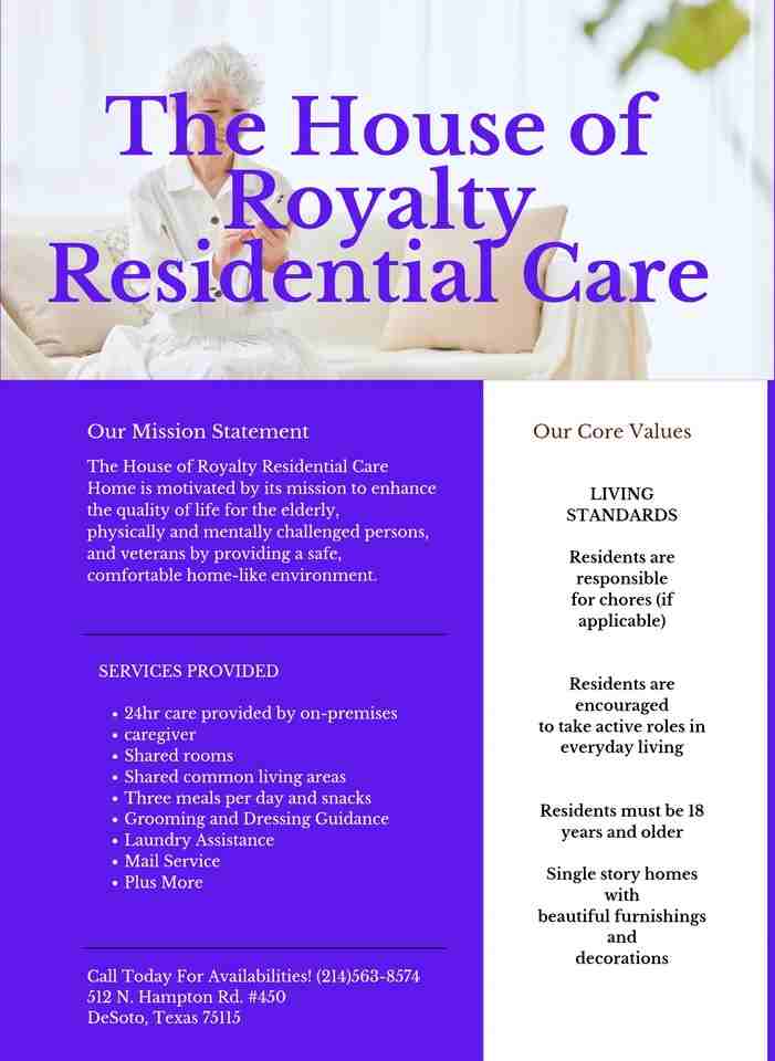 Property Id: 2449386 The House of Royalty Residential Care Home is motivated by its mission to enhance the quality of life for the elderly, physically and mentally challenged persons, and veterans by providing a safe, comfortable home-like environment. CONVENIENTLY LOCATED NEAR: MAJOR HIGHWAYS SHOPPING ENTERTAINMENT MEGA CHURCHES RESTAURANTS GROCERY STORES SPA SERVICES COMMUNITY CENTERS PARKS We accept Private Pay clients that are Veterans, Seniors and Hospice. In our luxurious homes, we offer plush living spaces, numerous amenities and specialized attention to you and yours.