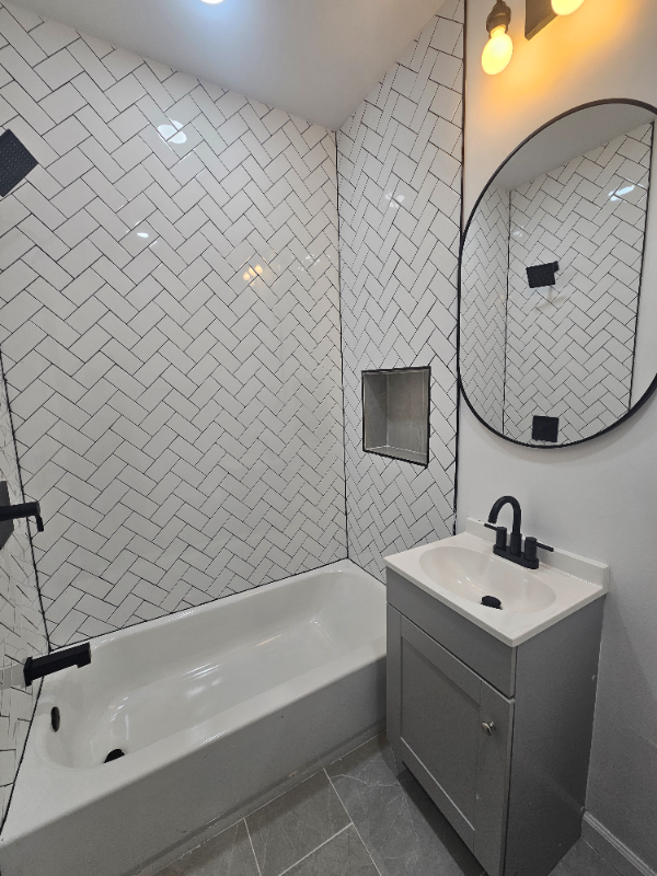 Property Id: 2399506 Welcome to this beautifully renovated apartment featuring sleek, contemporary upgrades throughout. From the moment you walk in, you’ll appreciate the open layout, high ceilings, and wide-plank gray flooring that creates a bright, airy feel. The kitchen is outfitted with stainless steel appliances, modern cabinetry, and clean-lined finishes that blend style and functionality. Recessed lighting throughout the home adds warmth and a polished touch. The bathroom is a true standout, showcasing a stunning floor-to-ceiling herringbone tile surround, matte black fixtures, a soaking tub, and a modern vanity with updated lighting. The spacious bedroom offers large windows for natural light, generous wall space, and a clean, minimalist aesthetic ready for your personal touch. Perfect for tenants seeking a move-in-ready space with modern design and low-maintenance living.