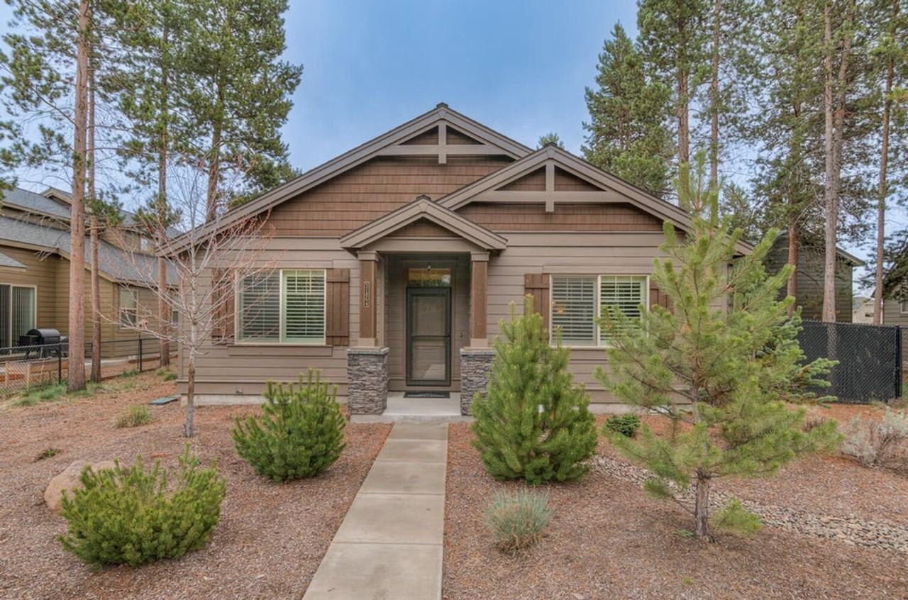 Single level 2017 Palish model home is nestled in the trees giving this property a homey mountain feel! Walk inside to an open floor plan with vaulted great room, and a floor to ceiling stone gas fireplace. Updated & upgraded laminate flooring, beautiful marble kitchen countertops in this nicely appointed kitchen. Primary Bath has double sink vanity & tile flooring. There's a fenced side yard with a patio to the right side of the house for entertaining. Alley accessed oversized double car garage has abundant storage. Community Clubhouse with access to paved trails, gym, and sport courts and social area.