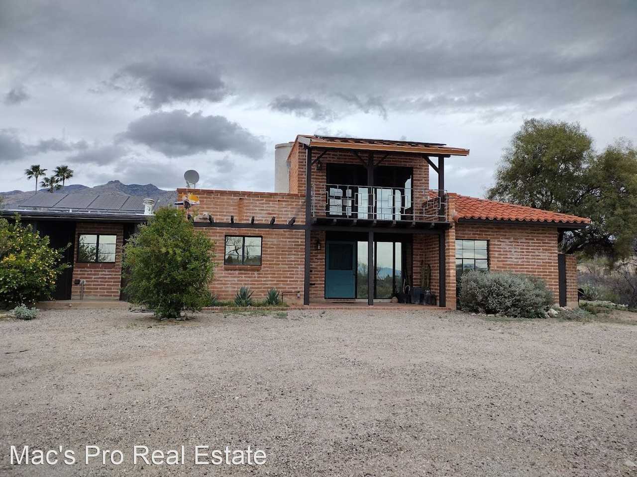 5211 E Camino Francisco Soza - AVAILABLE NOW! 2BR, 1 BA, Plus Loft, 1881 sq. ft. home in the Catalina Foothills. This beautifully unique home is just filled with character and is abundant with beautiful mountain and city views. It features a ton of large windows, step-up living room area with wood floors, mounted flat screen TV (also included, but no cable) and a dual-sided fireplace, built-in benches with storage along the living room windows, custom saguaro ceiling, brick and concrete floors, brick walls, tons of storage space throughout. The home also features a custom spiral staircase that leads to a loft area that overlooks the living room on one side with a view through banniser and on the other side is a door that leads off to a balcony that offer an amazing view of the city lights at night. Master bedroom has a huge extended closet and extra built in storage cabinets. Kitchen includes refrigerator, gas stove, dishwasher, countertop microwave, lots of cabinet space, pantry and bay window. Large bathroom has a creative concrete and stone designed floor, walk-in shower and large garden tub fashioned in beautiful step-up tile enclosure. Also includes living room, formal dining room, ceiling fans, W/D H/U, A/C, 1-car carport with plenty of additional parking in front, dirt driveway circle in front of the house with tons of natural desert space on a spacious 2.73-acre lot perfect for those who appreciate their privacy and welcome the Arizona desert and all it's wonders. Rear yard includes bar-be-que and in-ground fire pit with bench seating circled around it makes for perfect outdoor gatherings. Tenant is only responsible for water, trash, and gas, but the updated heat pump with back-up gas furnace helps to keep your gas bills low and the solar panels will help with your electric bill. Close to Ventana Canyon Golf & Raquet Club, La Paloma Country Club. In the Catalina Foothills School District: Ventana Vista Elementary, Esperero Canyon Middle School, Catalina Foothills High School. $2,600/mo., $2,550 sec. dep. Pets with approval and additional pet deposit. Craycroft/Sunrise - South, R-Camino Francisco Soza.