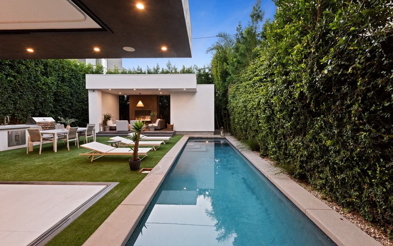 Available full-furnished and turnkey for short or long-term rentals! Pamper yourself in the exquisite luxury of this modern home. Step behind the pedestrian gate into the walled privacy of nearly 5,600 square feet of indoor-outdoor living spaces. Grand open plan living areas with grand central staircase, high ceilings, walls of glass, and expansive pocketed Fleetwood door systems connect you with two open air garden courtyards and the secluded back yard with pool, spa, 230 square foot cabana with fireplace, and BBQ are ready to serve you whether you're relaxing or entertaining. The 1,100 square foot rooftop deck with outdoor bar and fire pit is ideally suited to lounging or celebrating under the sun or stars. Retire to the sumptuous master suite with large private balcony, and spa-style bath while 4 guest rooms await your family and friends. Custom designed, fully furnished, and tastefully decorated, this wonderful home includes: gourmet kitchen with Miele appliances, oversized center island and large pantry- 4 fireplaces (2 Ortal)- Sonobath powder room- imported designer bath tiles & fixtures- hardwood floors- outdoor fitness areas with yoga mat for free weight and resistance band training, and state-of-the-art Crestron home automation system for your comfort. Call for short term pricing.