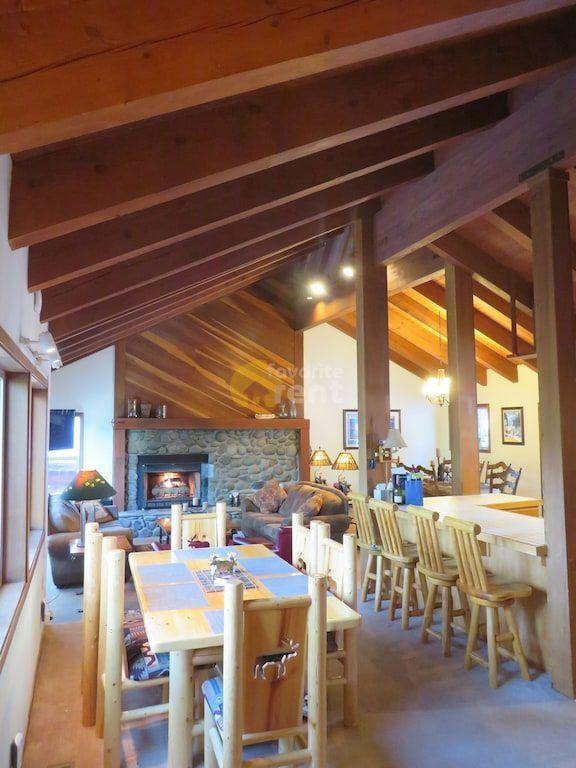 Beautiful views from this 4-bedroom 2.5 bath 2537 SF home in Northstar Resort. All new in 2019 and 2020. Front deck/stairs with black mesh railing. Outdoor lights. Rock retaining wall (driveway). King log bed, dresser and coat trees in MBR. Exterior door in MBR to hot tub with built-in shade to control light/privacy. Dishwasher with 3 racks and 39 decibels. Gorgeous views from the many windows on both sides of the spacious open concept great room with cathedral ceilings, a dining table with seating for 8, 2 comfortable couches and 2 swivel leather club chairs in front of a large gas fireplace, spacious kitchen with island, and bonus puzzle/game/craft table. A large wall-mounted TV has 99 channels of cable TV, a DVD player and an Apple TV. Plenty of room to congregate and spread out! A gas grill with 2 filled propane tanks is also provided for grilling. 3 bedrooms on the first floor (one queen, one twin over twin bunk beds, one with twin over double bunk bed and twin over twin bunk bed) and a large master bedroom (king bed) on an upper floor. One bedroom has a twin over twin bunk bed plus a fun kid/teen entertainment area with a large beanbag chair and soft lounger. In the same bedroom, enjoy competitive games of foosball as well. Another bedroom has a cute teepee with lantern for smaller ones to let their imagination run wild. Queen and master bedrooms have TVs but no cable access. 2 car detached garage. Pets are allowed. -- LID 45002350