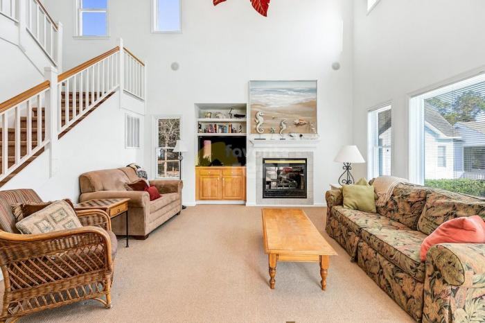 Cozy and charming 3-bedroom home, located in the Magnolia Bay section of The Currituck Club resort. A few of its delightful features include a private pool (open mid-May to mid-Oct.), a hot tub and the home is pet-friendly for up to 2 dogs. Beds: 1 King Master, 1 Queen, 2 Bunk Bed Sets TOP LEVEL: The spacious King Master Suite features a jetted tub in its master bath. There\'s also a Queen bedroom which shares a bathroom with a bedroom that has 2 Bunk Bed sets. The bedrooms have flat-screen TVs. ENTRY LEVEL: The Great Room has vaulted ceilings and encompasses a spacious living area with flat-screen TV. The fully-equipped kitchen has a bar counter (seats 4) and the round table in the Dining Area seats 7. There is a half bath on this level. There\'s access to the screened porch with additional seating. The back deck also features a hot tub and a few steps down to the private pool which measures 13\' x 32\'. The garage has been converted to a game area with Foosball and a Ping Pong table. An outside shower is available. -- LID 45001454
