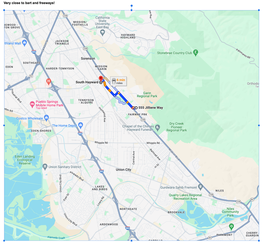 Charming Studio Apartment in Hayward's Mission District Discover your perfect home in this beautifully remodeled studio apartment, nestled in the heart of Hayward's vibrant Mission District. Located at 555 Jilliene Way, this gem offers the perfect blend of comfort, convenience, and natural beauty. Highlights: - Completely remodeled with ample cabinet space - Private entrance from the street - Private bathroom with shower - Private kitchen area - Brand new flooring, lighting, and fresh paint throughout - Spacious bedroom with 4-5 large storage closets - Ideal for a single occupant, college student, or professional Neighborhood Perks: - Walking distance to hiking trails and green spaces - Easy access to BART and bus stop right in front of the property - Close proximity to freeways and Hayward's shopping district - Quiet, peaceful area surrounded by nature Hayward is known for its central location and exceptional transit conn...