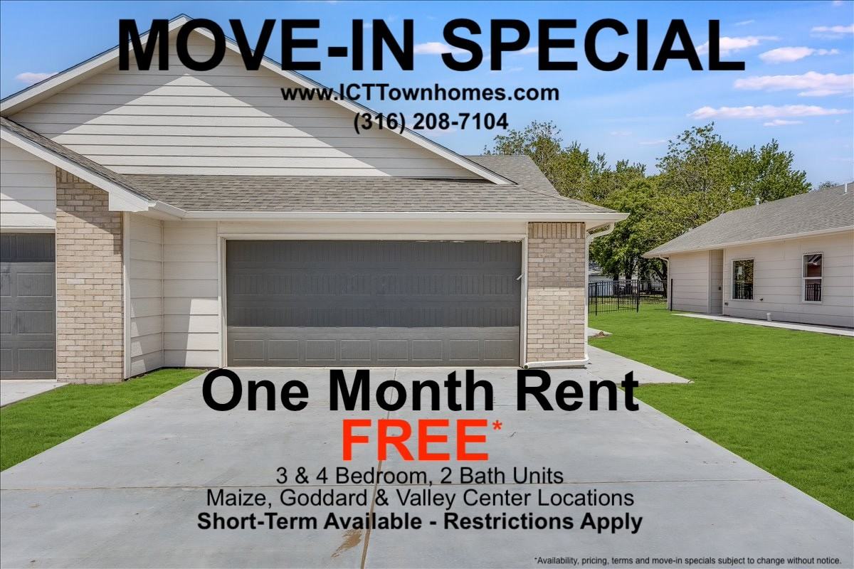 ONE MONTHS RENT FREE - EXCLUSIONS APPLY, CONTACT FOR DETAILS. TO SCHEDULED A TOUR OR APPLY TO RENT AN AVAILABLE PROPERTY, PLEASE VISIT OUR WEBSITE AT SHARPHOLDINGSLLCDOTCOM. Beautiful Molly Style Floorplan 3 bedroom 2 full bathrooms with 2 car attached garage, located near Valley Center at 53rd and N. Meridian close to 96 highway. The home features quartz countertops, tile backsplash, luxury vinyl flooring, and neutral finishes. Kitchen appliances excluding refrigerators are provided. Tenant pays all utilities, *Maintenance Free Living* HOA is responsible for mowing and the lawn irrigation. Security deposit equal to one months rent. Maximum 2 pets are allowed with pet deposit equal to 1/2 one month rent and $25/pet monthly pet fee. All adults occupying the property must complete an application. Applications are processed on a first come first serve basis, and will not be processed until they are fully completed. At least one year rental history with reference is required, 3x's gross income to monthly rent ratio, credit and background review. Co-signer may be required if one or more of the above requirements are not met. Other floor plans available that are currently under construction.