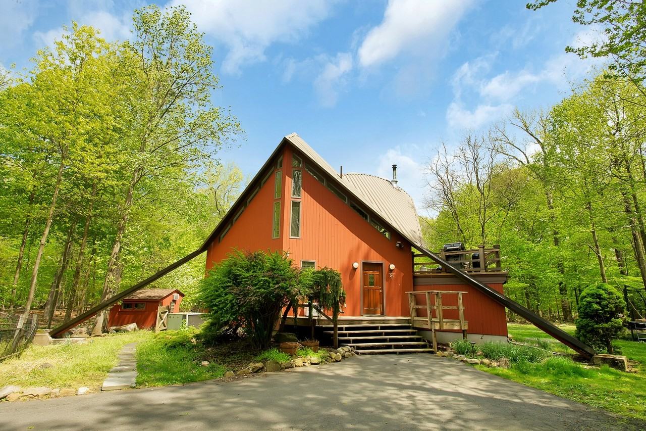 Private road leads to a wooded enclave bordering a Nature Preserve that surrounds a unique, 2,042 square foot contemporary home designed in 1984 by creative architect Don Gellert. Property is located in a magical setting with a bubbling fish pond and a sparkling waterfall. The beautifully renovated frame dwelling features a dramatic double roof that leads rainwater down a trough to garden planters. The house is surrounded by a patio garden, vegetable garden, two garden sheds, a pond with a motor-driven waterfall, and a second level wrap-around balcony with two stairways leading down to the gardens. Newly renovated with chef's kitchen, new baths, updated utilities.