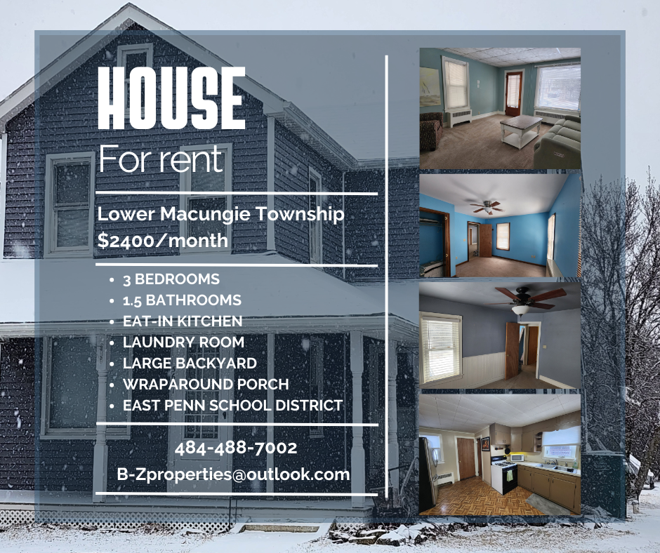 Amazing 3 bedroom, 1.5 bathroom house in Macungie. Amenities included: front porch, back deck, remodeled bathroom, storage, laundry room with washer/dryer, refrigerator, microwave, gas range/oven, and large yard. Utilities included: water, sewer, and garbage. Is not pet friendly. Date Available: Apr 1st 2025. $2,400/month rent. Please submit the form on this page or contact B&Z Properties at 484-488-7002 to learn more.