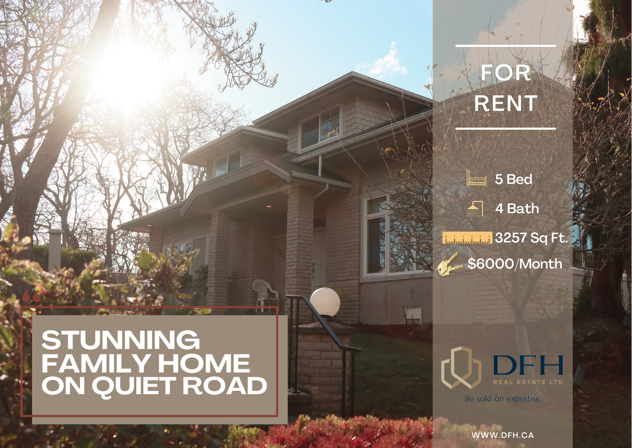 [Oak Bay] [Dec 1st] [$6000] We are delighted to announce that we have a new property available to rent! Situated in a beautiful, quiet area in South Oak Bay, this house has everything you could possibly want. The location could not be more ideal, as it is located close to all amenities, and is within walking distance to the golf course, shopping centre, schools and Anderson Hill Park. The house, at over 3,000 square feet is the epitome of spaciousness and class. Featuring 5 bedrooms and 4 bathrooms, the master bedroom is located on the first floor with en-suite and it also has a door leading out to the beautiful and tranquil back yard. The house also contains two living rooms and dining areas, with plenty of natural light coming through. The kitchen has a big island and looks out on to the back yard, which is the perfect setting for hosting family and friends on those lovely, warm summer evenings. The home has two fireplaces which brings with it a real sense of warmth and coziness. Upstairs has the 4 other bedrooms, which are all a good size, with 2 of them being ideal for use as offices o guest rooms. There is also a nice, upper deck to take in those rays of sun. The property is available on a fixed-term contract for 1-Year and dogs are allowed, but not cats. The stunning home could be yours soon, so get in touch with us today for a viewing before it gets snapped up. DFH REAL ESTATE LTD.