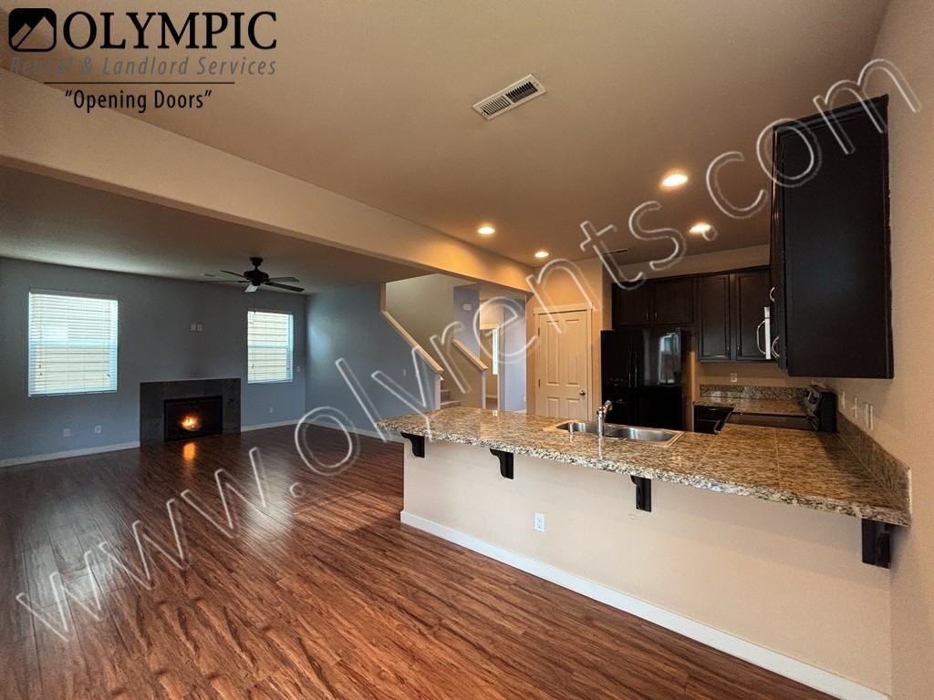 4 Bedroom + Den, 2.5 bath Home with 2 car garage. Located on a corner lot in Summerwalk Village neighborhood. 2039 sq ft. Built in 2014. Wood flooring downstairs. Gas fireplace & heat. Kitchen has granite tile countertops, breakfast bar, pantry, refrigerator, glass-top range, microwave and dishwasher. Laundry room is conveniently located upstairs with hookups for washer and dryer. Primary bedroom has vaulted ceiling with ceiling fan, 5 piece bath and walk in closet. Neighborhood park. Low maintenance fenced courtyard. No smoking. Pets negotiable with additional rent and deposit. City of Lacey. Visit our website to watch the video tour!