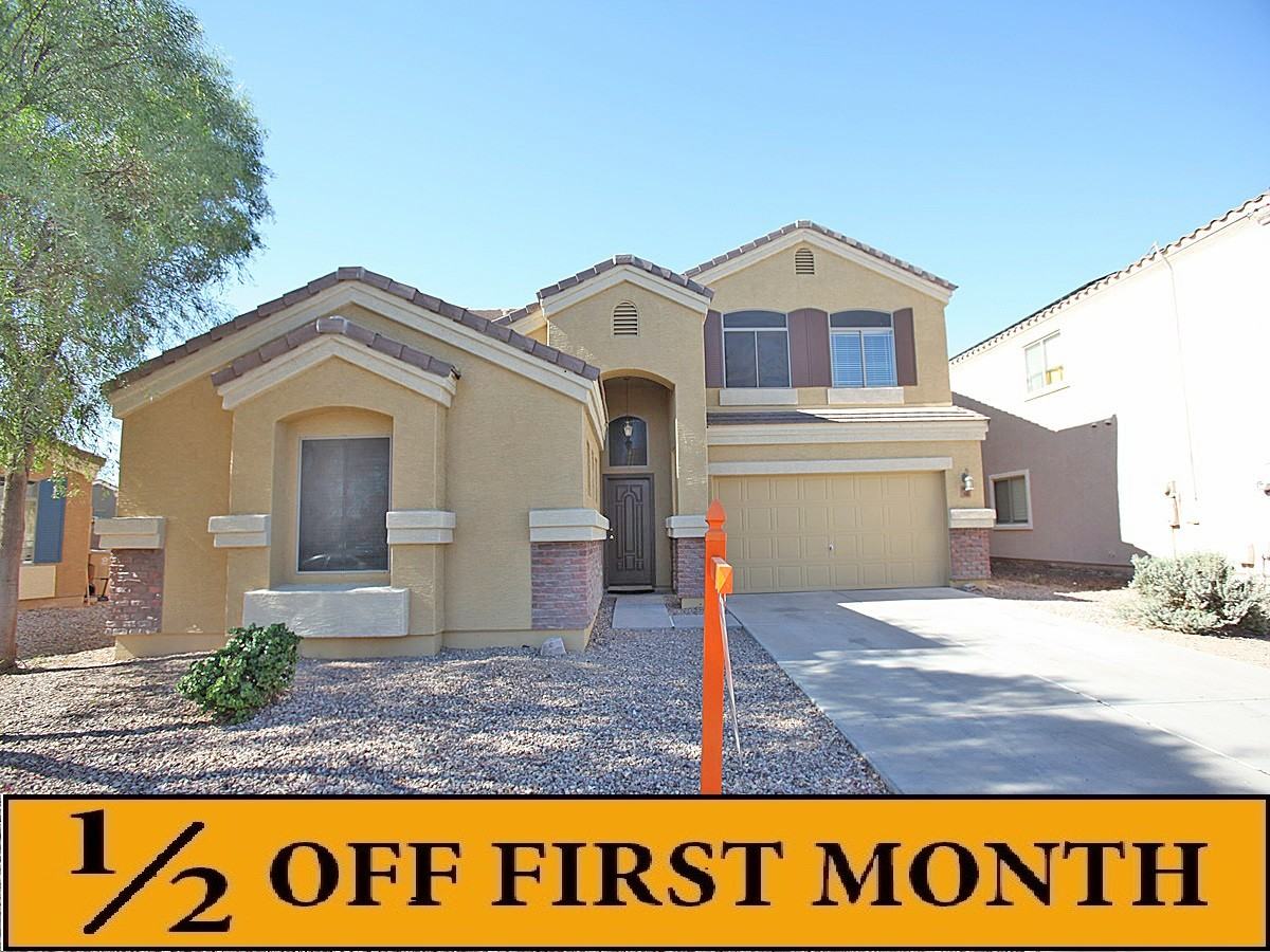 **1/2 OFF FIRST MONTHS RENT!** UPGRADED HUGE 5 BEDROOM!! 5 Bathroom + 2.5 Bathroom House in Buckeye. Kitchen features stainless steel appliances, including built in microwave, dishwasher, refrigerator and stove/range. Large living room and formal dining room. Pantry and breakfast bar/island. Ceiling fans and blinds throughout. Master suite includes walk in closet, dual sink, tub/shower combo and private toilet room. Large covered patio leads to large grass backyard. 2 car garage with opener. Call now to view, this home will not last long!