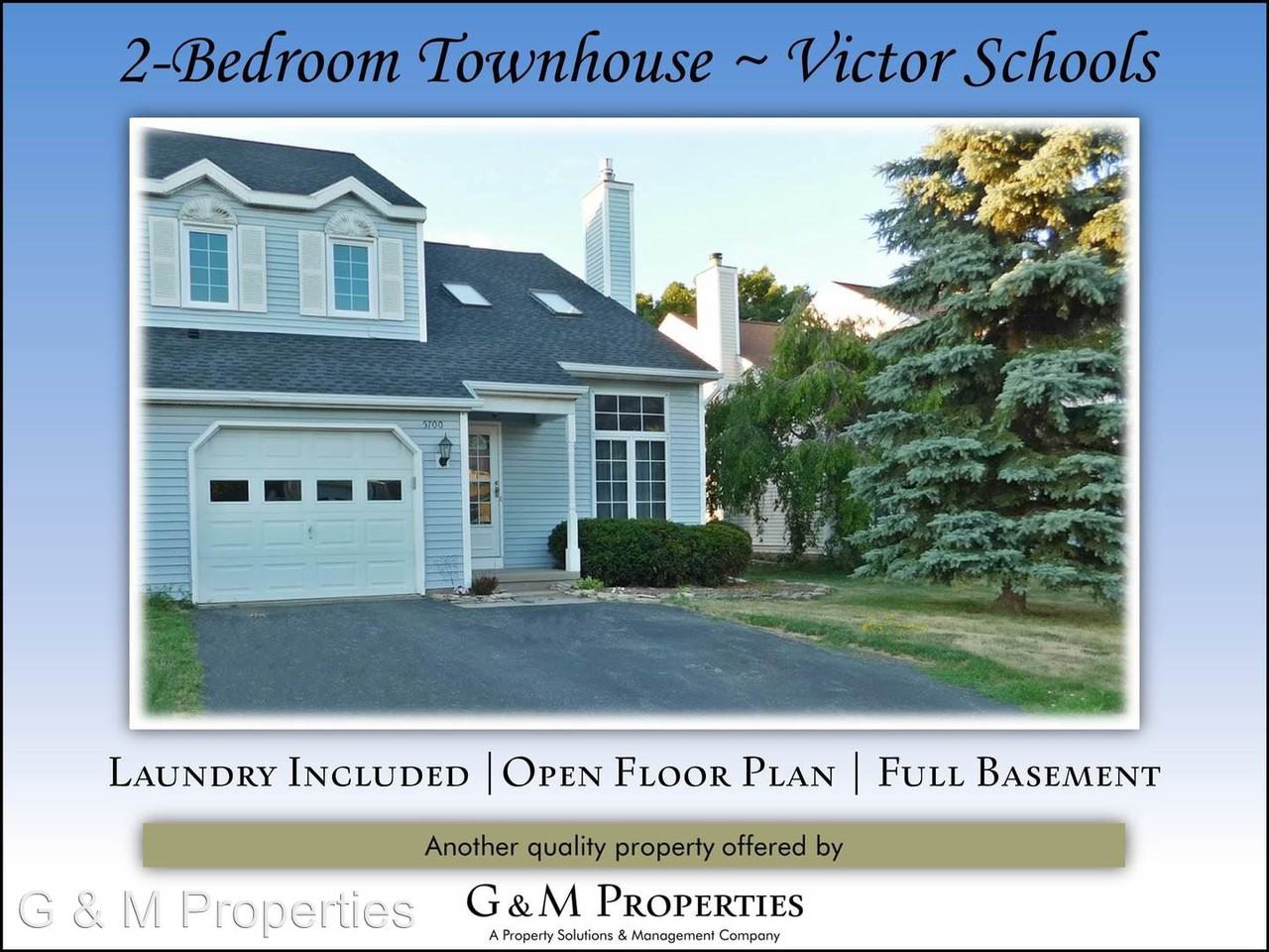 2-Bedroom Townhouse Rental - Victor Schools! - Check out this 2-bedroom townhouse for rent in Farmington! The living room is large and spacious, with vaulted ceilings and sky lights that flood the room with natural light. The dining room area is huge, with sliding glass doors that take you to a deck that overlooks the backyard. The kitchen is spacious as well, and includes all of the appliances. Upstairs you'll find two large bedrooms, each with their own full bath. There is also a balcony / loft area that would be perfect for a sitting area or office work space. There is a washer and dryer on the first floor that is included as well, in addition to a half bath for your convenience. There is an attached one-car garage as well a full basement. Located just minutes to the NYS Thruway, Eastview Mall, Victor Schools, Canandaigua Lake, and all the shopping and restaurants you could ask for. This is another fine property that is professionally managed by G & M properties. You'll love living in your own end-unit townhome, and still have all the benefits of apartment living like 24-hour 1-call maintenance and online rent payment. Call TODAY to schedule your walk-through. This one won't last long! G & M Properties - (585) 568-7275 Monthly Rent starting at $1,175. Please call for details. ------------------------------------------------- **No Section 8** **No DSS** **No Smoking** **Credit Check / Background Check Required** No Cats Allowed