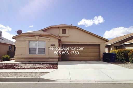 Southwest landscaping front/back. Single level, large living area w/ceiling fan opens to dining and kitchen. Master bedroom w/ceiling fan, large walk-in closet, single vanity, garden tub, separate shower, sliding door access to patio. Spacious spare bedrooms, full hall bathroom, linen closet, carpet and tile throughout the home, window blinds, laundry room with washer hook-up and electric or gas dryer hook-up. Evaporative cooling, backyard covered patio with extended concrete slab, 2 car garage with remotes. DIRECTIONS: From Unser, E. on Bandelier> R. on Don Giovanni, R on Carmen