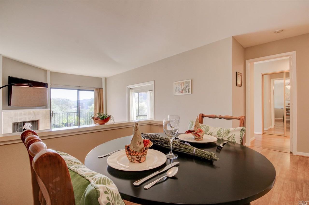 Live in your own, cozy nook of beautiful Mill Valley! Green mountain and bay views from inside rooms and outside deck in this open, light, bright, feel-good sanctuary. Fireplace in living room. Re-done kitchen, bathroom, and electrical. Fresh blonde wood laminate floors throughout. Big screen TV on adjustable wall mount. Custom French doors will soon be installed between living room and bedroom for privacy. Exceptional commute location: easy access (and two routes) to freeway and public transportation; 5-min drive to parking for Google, Genentech and other tech company employee busses. Elevator building with elevator close to unit. Covered parking spot. Separate, roomy private storage area fits bikes and indoor and outdoor equipment. Pool and spa (currently being repaired)on grounds, and shared green space surrounds you. Pet okay with increased deposit.