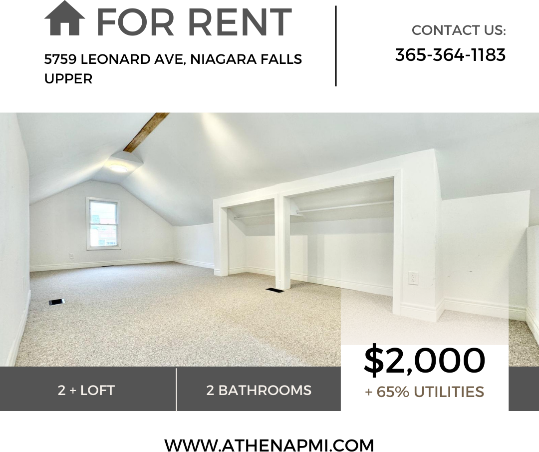 Welcome to 5759 Leonard Ave, Niagara Falls – Upper! Located in a peaceful neighborhood, enjoy the convenience of nearby amenities including shops, restaurants, parks, and schools. Your new home awaits in this charming upper unit of a duplex. This freshly updated residence boasts: - Open concept layout - Stainless steel fridge, stove, and dishwasher - Ensuite laundry - Two main floor bedrooms + entire loft - Two full washrooms - one w/tub, one w/shower - Private front porch entry - Private enclosed sunroom - Shared backyard - Tandem driveway parking This unit is move-in ready and available for immediate occupancy. Available for $2000 + 65% utilities To book a showing, please call the number or use the link below: 365-364-1183 https app tenantturner com listings athenapmi (Copy and paste to browser if needed)