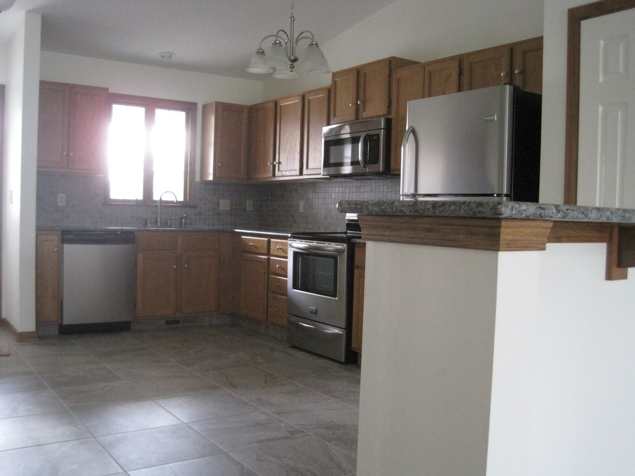 Stunning 1,150 square foot open floor plan two bedroom 1 bath ranch condo with attached garage. Steel front entry door with decorative glass storm door, wide open floor plan features striking oversized porcelain tile in foyer, kitchen, laundry and both baths. Granite counter kitchen and bar, porcelain tile backsplash, 2 pantry closets. New stainless steel appliances; Frigidaire Gallery self cleaning gas range, over range microwave, dishwasher and refrigerator. Spacious 1st floor laundry off kitchen with utility sink, tiled backsplash, hanging rack, cabinets and washer dryer. New carpet throughout, fresh paint, new light fixtures. New roof. Master bedroom has a half bath and designer walk in closet. Top of the line in everything here, no expense spared. New high efficiency furnace and new central air throughout. Trouble free, move in ready. Includes new washer and dryer. Quiet cult a sac street with cement driveway and private cement patio off great room. Professionally managed maintenance free living; we handle the snow, lawn and pay for trash pickup. Resident responsible for water, electric, gas and phone/cable. Asking $925/ month. No pets and no smokers please. We screen our residents. You will not be disappointed! Please call for a private showing. Available March 1 2019.
