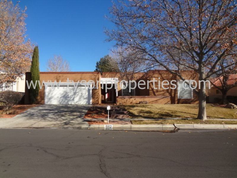 This beautiful home is a one story located in the NE area with great mountain views. This home has grass in the front and back yard with mature trees. The master bedroom is separate from the other 3 bedrooms. All of the bedrooms are a good size with lots of closet space. There is a family room with a wood burning kiva style fire place. The kitchen comes with all appliances and great views to the back yard. Directions: I-25 North, Exit at San Mateo, Right on San Mateo, Left on Academy, Right on Lowell, Left on Tamarac, Left on Mahogany For more information please visit our website at www.tysonproperties.com or call at 505-323-2104. Please keep in mind that we rent our homes fairly quickly. We look forward to meeting you and helping you find the perfect home!