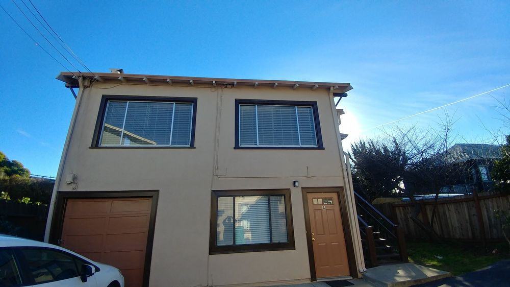 Upper unit in duplex behind house on same lot. Tons of natural light in this freshly painted unit with laminate flooring and 2in. blinds throughout. Large open living/dining area with original built in shelving/cabinets. All electric galley style kitchen with stove. Kitchen includes a small breakfast area as well as extra office/pantry room where refrigerator is. Brightly lit bedroom with bathroom off of it. Clawfoot tub/shower. Water and garbage included with rent. Parking may be available. Cats considered with deposits and insurance.