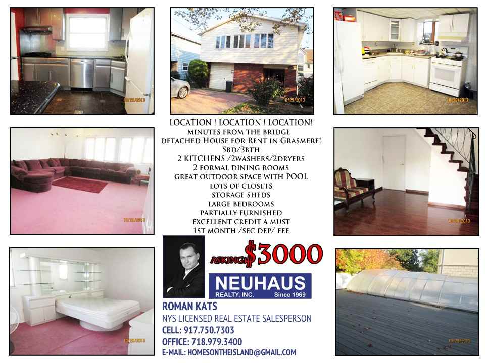 LOCATION , LOCATION, LOCATION. Detached house is for rent just minutes from the Verrazano Bridge. Mother-daughter set up 5-bedrooms, 3-bathrooms 2 kitchens 2-washer 2-dryers large rooms with closets, partially furnished. huge backyard with Pool tenant must have good credit.