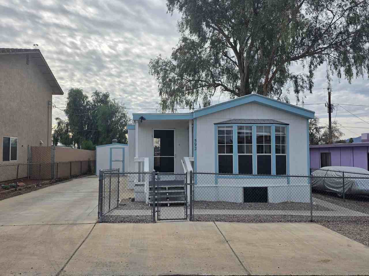 Newly refurbished manufactured home located in the heart of Central Bullhead City. This spacious 2-bedroom, 1-bath home feels larger than expected and features fresh white interior paint, new carpet, vinyl plank flooring, and a fully enclosed Arizona room. The home comes equipped with a washer, dryer, and refrigerator, along with new ceiling fans and updated lighting throughout. The fully remodeled bathroom includes a modern vanity, new lighting, and a beautifully updated tub/shower. Outside, enjoy a fully fenced yard with RV parking and a large Tuff Shed for additional storage. Schedule your showing today!