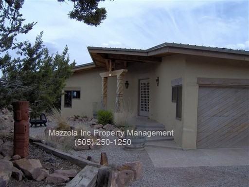 Stunning architectural masterpiece with spectacular views from almost every window. 2600 sq ft with 4 bedrooms and 3 bathrooms. Saltio tile entry with planter invites you into this exciting contemporary home. Kitchen and dining overlook the 2-level great room with fireplace and bonco seating, tiled wet bar and 2 sitting areas. Master bedroom retreat has sitting area, huge walk-in closet with soak tub. 3 additional bedrooms and 2 bathrooms. 2-car garage plus separate 1-car garage/workshop. Wrap around deck with outdoor wet bar, overlook peaceful valley, 2 acre lot is wooded and landscaped with native plants. Call Liz for more details or a showing, (505) 250-1250.
