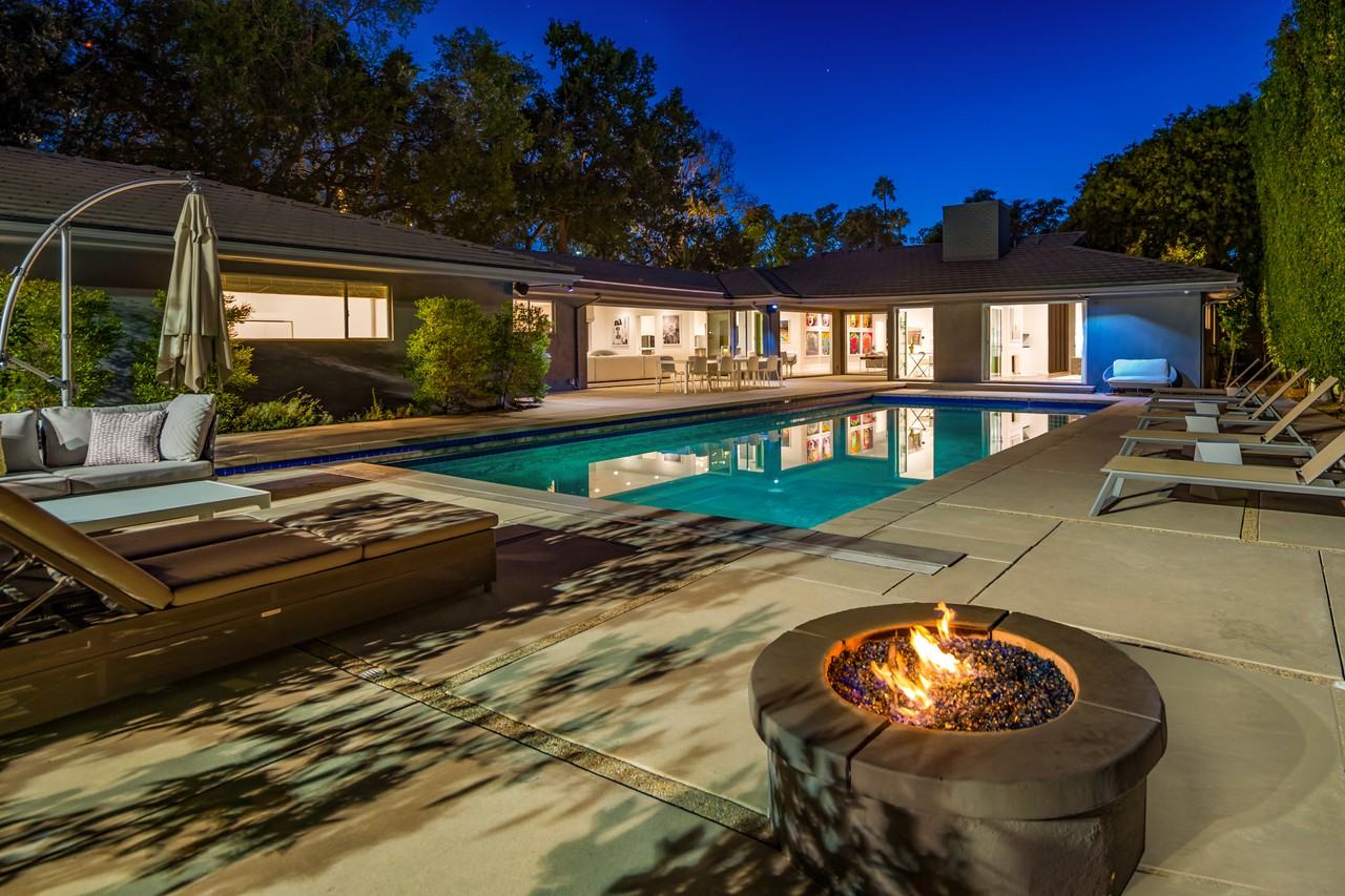 FULLY FURNISHED. SHORT TERM AVAILABILITY. This single-level contemporary home is a master class in luxury featuring smart home technology and is designed with a sleek, high-tech feel. The expansive 6 bedroom, 6 baths open floor plan is set around the sparkling pool where you can step outside from all of the living areas into your own private oasis with a sunny poolside terrace featuring al fresco dining, lounge areas with a fire pit and immaculate gardens that provide complete seclusion and privacy. The banks of glass doors and skylights throughout the house allow an abundance of natural light to fill the home as well as create a seamless connection with the surrounding environment. Reminiscent of a luxe hotel, no expense has been spared to create this designer abode. Hardwood floors, high-end appliances, tennis court, gym complete this luxurious home. ALSO AVAILABLE SHORT TERM/SEASONAL.