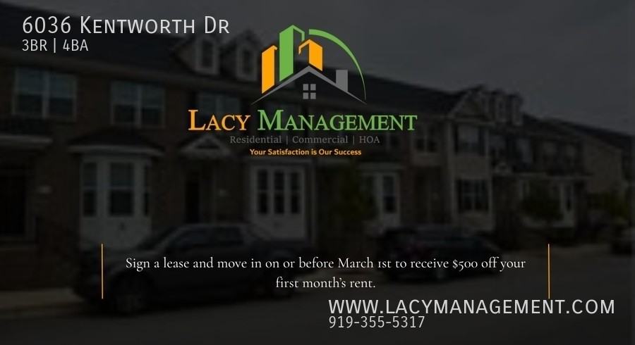 Discover modern comfort and convenience at 6036 Kentworth, Unit 1, located in the highly desirable Main Street Square community in Holly Springs. This beautifully designed 3-bedroom, 3.5-bath townhome offers 1,740 sq ft of stylish living space with thoughtful finishes and a functional layout—perfect for today's lifestyle. ***Sign a lease and move in on or before March 1st 2026 to receive $500 off your first month's rent.*** Step inside to a bright, open-concept main level featuring a spacious living area that flows seamlessly into the dining space and contemporary kitchen. The kitchen is well-appointed with sleek cabinetry, ample counter space, and modern appliances—ideal for everyday living and entertaining alike. Each bedroom offers generous space and its own bathroom, providing comfort and privacy for residents and guests. The primary suite serves as a relaxing retreat with an en-suite bath and ample closet space. A convenient half bath on the main level adds extra functionality. Enjoy low-maintenance living in a vibrant community just minutes from shopping, dining, parks, and major roadways. With easy access to local amenities and everything Holly Springs has to offer, this home combines location, comfort, and style. Don't miss the opportunity to make this beautiful townhome your next home—schedule a showing today! Schedule an online showing at: https showmojo com 3437c1a061 listings mapsearch Submit your application online at: https rent findigs com 2cdc0519-8cc4-4c21-9f8f-94054eda96d2 Resident Benefits: **Get over $100 in monthly benefits for just $49.95 with our Resident Benefits Package! Enjoy valuable services with the flexibility to customize or opt-out *** Application Criteria: a) Gross household income of at least 3 times the rent b) A credit score of 650+ is preferred; we are happy to discuss your situation if your credit score is lower c) No evictions in the last 5 years d) A one-time pet fee of $300 per pet applies. An additional deposit may be required for multiple pets. No monthly pet fee; pet screening is required after application approval: $30 per pet. e) One-time admin fee of $250 required to pay after signing the lease. The marvelous community of MSS has much to offer including small block parties and social gatherings. Schedule a showing online at https showmojo com 3437c1a061 listings mapsearch Submit an application online at https lacymanagement managebuilding com Resident apps rentalapp