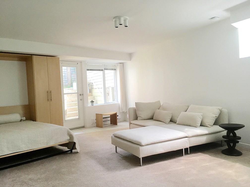 A beautiful studio apartment in an architect-designed modern home located downtown, within walking distance to the Eaton Centre, St. Michael's Hospital, TMU, the Distillery District and many other food and entertainment amenities (walkscore = “paradise” 91/100). Recently renovated with oak-finish built-ins that make this space semi-furnished. Built-ins include a Murphy bed, open shelving units, desk and entryway coat closet. Additional enclosed closets space. Only basic furnishings required to make this a cozy home. Lower level location with a gated entrance. Private entry large enough for outdoor table, two seats and potted plants. Excellent natural light from two full-size windows and a glass door. In-suite washer/dryer 4-piece bathroom Open kitchen with stove, oven, fridge, freezer, microwave 24/7 security and a quiet environment. New carpeting throughout. Street parking available with permit.
