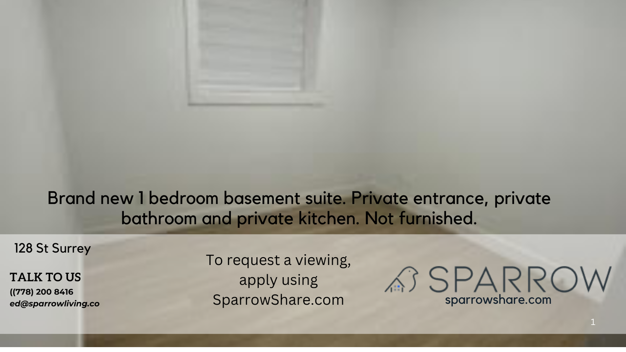 **Inquire Now: For fastest response, text me at +1 778 200 8416** Private 1-Bedroom Basement Suite in Surrey Brand new, completely private 1-bedroom basement suite on 128 St, Surrey. This suite offers a private entrance, private kitchen, and private bathroom for ultimate independence and convenience. Located in a welcoming neighborhood with a strong sense of community, it's perfect for anyone seeking a peaceful living environment. Utilities are included, and laundry machines are available for use. Street parking is conveniently located at the back. Note: The suite is not furnished, allowing you to create your own personal space. Basement Suite: CA$1630 Private Room and Private Bathroom ( Double bed) Available now Furnished : No Some more info: Utilities & Amenities: Air Conditioning, Cable TV, Heating Washer, Dryer, Internet Shared Items: Coffee Maker, Dishwasher, Dishes & Silverware Fridge, Kettle, Microwave, Oven, Pots & Pans Stove Parking & Facilities: Bicycle Parking Shared Spaces: Kitchen, Backyard, Balcony Dining Room, Family room No Pets allowed Address:(128 Street & 64 Avenue Surrey ) Payment: Security deposit after signing the agreement, then pay the 1st month's rent before move in-date. The security deposit will be returned at the end of the lease term, conditional on the property being left in its original condition, minus normal wear and tear. Requirements: Copy of ID Credit Check If student, proof of enrolment If employed, proof of employment and/or income 2-no maximum rental agreement First month and rent deposit required Non-smoker, preferably a student or a professional Additional Benefits: Tenant Insurance Included: Renting through Sparrow includes tenant insurance at no extra cost, providing you with added peace of mind. Credit Building: Your rent payments through Sparrow will be reported to credit bureaus, helping you build and boost your credit score over time. Disclaimer This listing has been syndicated from sparrowshare.com, including its content, rental terms, and images. Sparrow is used to verify the identity and compatibility of those interested. The advertised property is owned and/or managed by Ed from Sparrow Living Inc.