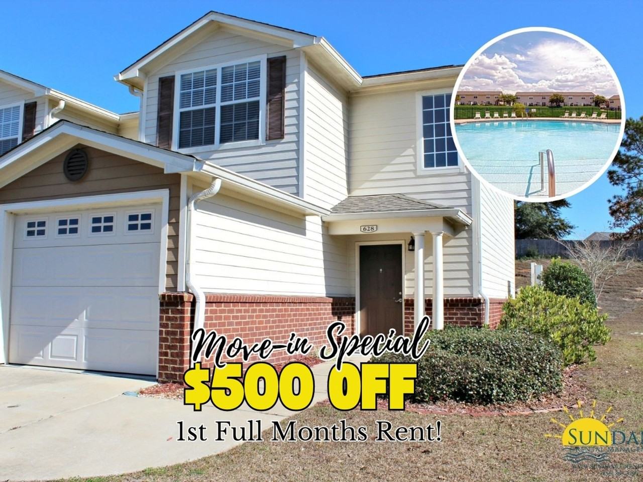 Move-In Special: $500 Off 1st Full Months Rent! Located in Crestview conveniently close to I-10, shopping and dining this great 2 bedroom, 2.5 bathroom 2 story townhouse offers an attached 1 car garage along with driveway parking. This unit is a true must see! The interior features a spacious living/dining room, a full kitchen with breakfast bar/window that overlooks the living area, a half bathroom downstairs that doubles as the laundry room with washer and dryer hookups and 2 roomy bedrooms upstairs each with their own private bathrooms. Outside you will enjoy an open patio perfect for relaxing and community pool. You do not want to miss the chance to call this lovely unit home! Pets max 2 under 25lbs (no cats) are accepted with a non-refundable $250 per pet plus a $50 admin fee (subject to owner approval) Lawn maintained by HOA. Smoking is not permitted. HOA rules and regulations apply. In addition to the rental amount, all Sundance Rental Management residents are enrolled in the Resident Benefits Package (RBP) for $29.00/month. This includes the required $300K liability insurance, credit building to help boost the resident’s credit score with timely rent payments, and much more! Full details of the benefits can be found on our website under Tenant FAQ.