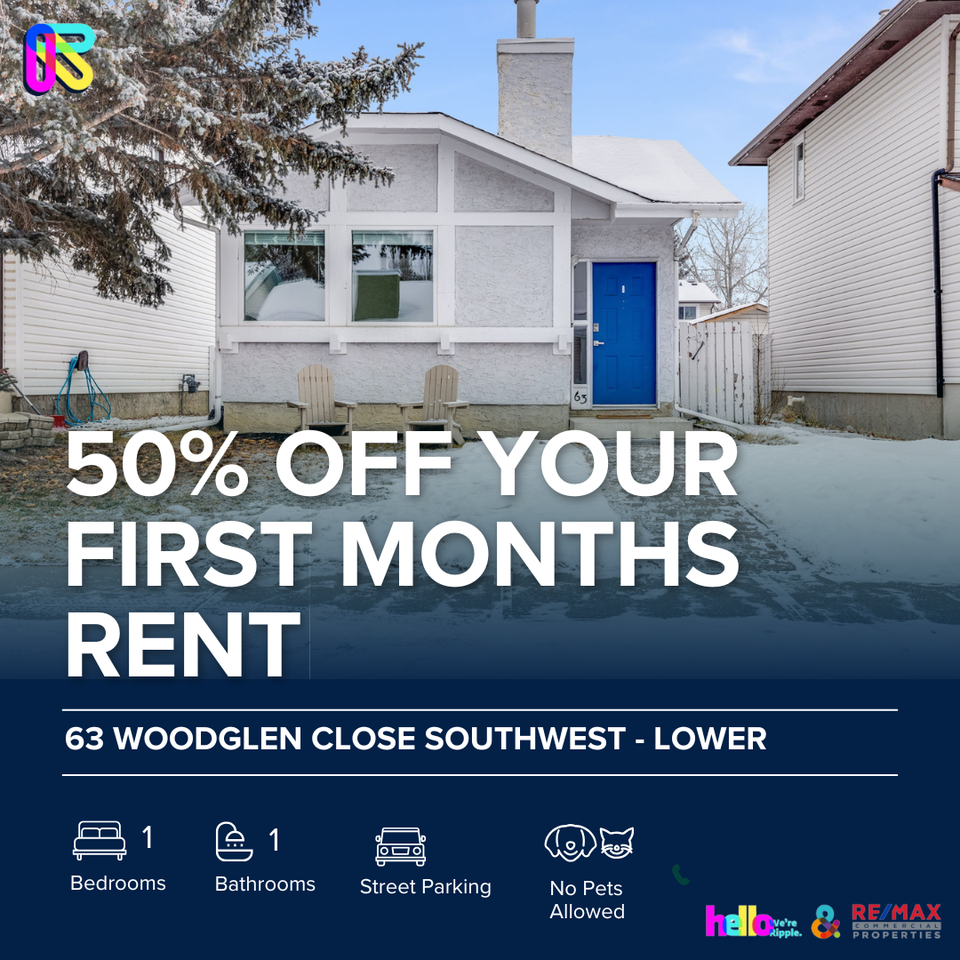 50% OFF YOUR FIRST MONTHS RENT! FANTASTIC 1 BED/ 1 BATH LOWER UNIT ONLY! VIDEO TOUR: https youtu be 8WER5aVG32g Interested in this unit? BOOK HERE: https showmojo com 79c3e9f0b2 l Use our automated booking system, ShowMojo, to schedule a showing. You'll receive a response within a few hours with available dates and times. Note: Showings are conducted in groups, not one-on-one. IMPORTANT INFORMATION: - Parking: Street Parking - Pets: No Pets Allowed - Smoking: Non- Smoking - Storage Included: No - Laundry: In suite laundry UTILITIES: Shared Utility Unit: This unit shares a utility meter with another unit. Utility costs will be split between the two units with 60% of the cost being paid by the main (upper) unit and 40% of the cost being paid by the secondary (lower) unit. A monthly utility deposit of $350 for the main unit and $225 for the secondary unit will be charged for the first three months of the tenancy. UNIT FEATURES: - Large living room with window for natural light - Open concept kitchen with all appliances - Main bedroom with plenty of closet space - Window Coverings Included COMMUNITY FEATURES: This property is located in a vibrant community with easy access to: - Shopping and grocery stores. - Tennis courts and recreational facilities. - Public transit (bus and train). - Parks, bike paths, river access, and playgrounds. A LEADER IN CALGARY PROPERTY MANAGEMENT This property is managed by Ripple Property Management—a name synonymous with quality and trust. With 15 years of expertise and a commitment to excellence, we make property management and renting a seamless and enjoyable experience. View more properties managed by Ripple Property Management: https showmojo com 79c3e9f0b2 l