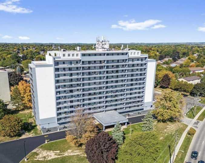 Desirable Village Tower LOCATION, LOCATION, LOCATION!!! Easy condo living in sought-after North end building! The building boasts many improvements and is walking distance to all amenities, on city transit route, and is literally just minutes away from hwys. 403 & 24! A quiet secured building offering desirable senior living accommodations. Affordable coin-operated laundry facility is located on the main floor, party room, gym, and billiards room. The unit is 945 square feet and sits high up on the quiet side of the upper floor floors. It is carpet-free, has an updated kitchen with built-in dishwasher fridge & stove. 2 spacious bedrooms and a renovated 3-pc bath with handy walk-in shower. The L-shaped dining room and living room are airy & bright and provide a nice space for relaxing Additionally, the living room steps out to the private covered balcony. This unit has 1 parking space!