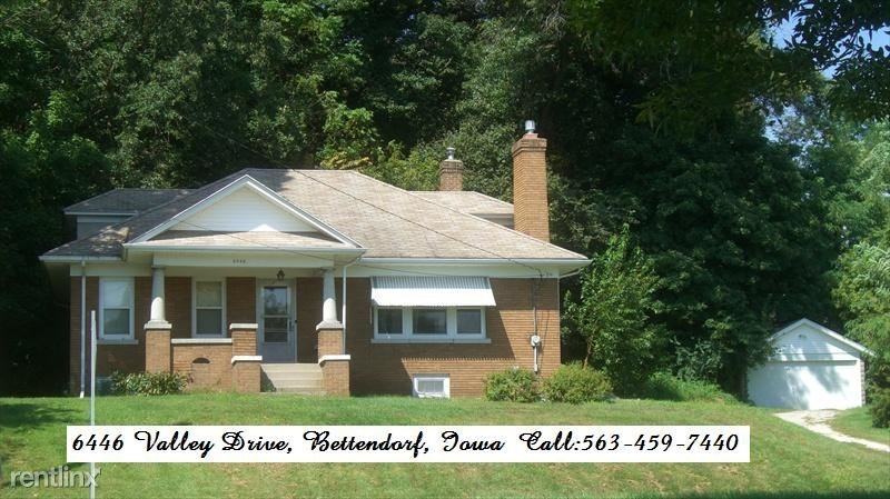 No Pets, No Smoking, No Section 8. Pleasant Valley School District. Available now, this clean 1920's built brick 2 bedroom bungalow sits on 2.19 acres within the City of Bettendorf, Iowa. This home was rewired a few years ago and new roof installed last year. This acreage is on City water with it's own septic system. There are oak hardwood floors throughout the main level. Stays cool with Central Air and is heated by a 92% efficient natural gas furnace. For an added cozy atmosphere, there is an 85% efficient natural gas log fireplace in the living room surrounded by built in oak book shelves with glass doors. There is a two way swing oak door between the kitchen and dining room. There are original tall pine kitchen cupboards which go to the ceiling and lower units include original tilt out bin. There is a full bath on main level with tub. There is a toilet and shower stall in the basement. There are four closets for storage, with one being a lit walk-in for the front bedroom. Additional storage space in walk up attic (no bedroom, wide open unfinished span). Appliances included are: washer, dryer, stove, refrigerator/freezer, dehumidifier. Smoke detectors are hardwired and home has carbon monoxide detectors as well as a fire extinguisher. There is a detached 2 car garage complete with door opener and remotes. Like years gone by, enjoy sitting on your own covered front porch. A small garden may be planted. Area wildlife includes deer, turkey, rabbit, squirrel, hawks, and an occasional Eagle can be seen flying by. There is a $35 application fee per adult, or $50 fee for married couple with same last name for a credit/criminal background check. A credit score of 600 is required for occupancy. This $900 per month rent is for a term Lease only. $1000 Deposit. Please call 563-459-744zero for a showing. No Pets Allowed