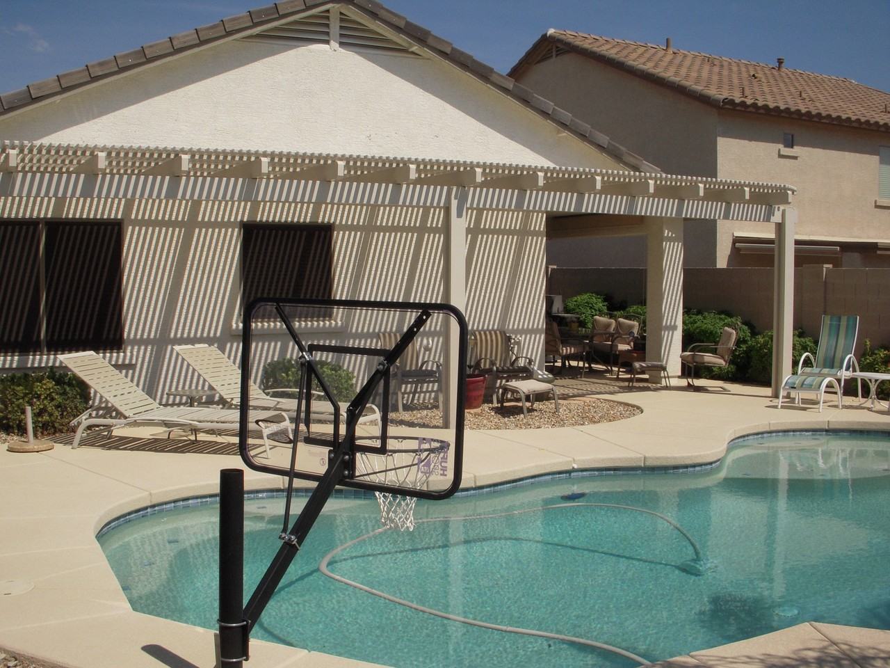 **AVAILABLE NOW** Welcome to your dream rental! This impeccably maintained home is stunning inside and out. large diagonally laid tile throughout kitchen and living areas along with the den. Open kitchen with granite counters and upgraded appliances. Large master bedroom and master bath with double sinks, walk-in closet, and separate shower/tub! Backyard is a dream with large play pool and basketball hoop; custom trellis and huge covered patio great for entertaining! FULL POOL SERVICE ALSO INCLUDED..CALL TODAY!