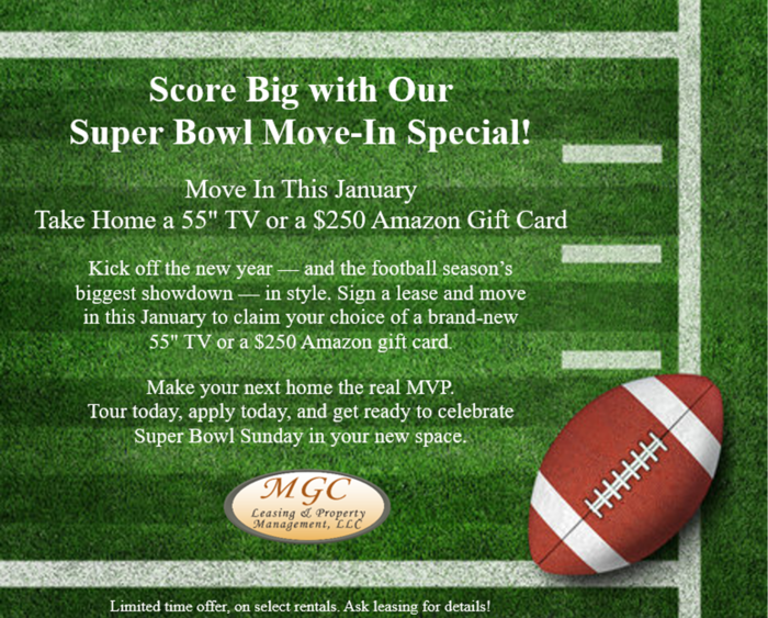 January Just Got Bigger — Super Bowl Move-In Special!... Start the new year — and the season’s biggest game — in style. Sign a new lease and move in this January to score REDUCED RENT, your choice of a BRAND-NEW 55" TV or a $250 AMAZON GIFT CARD. Settle in, get game day ready, and celebrate the Super Bowl from your new space. Offer available on select rentals. Ask leasing for details.