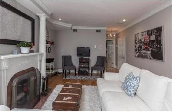 Stunning, renovated upper level 1 bed, 1 bath, not to be missed! This third floor unit, features include: open living room, dining and kitchen, high ceilings, great light, wood burning fireplace, jacuzzi tub, King size bedroom with walk in closet and en suite bath, central air, in unit laundry, great location,steps to public transportation, Boston Medical and more! This is a must see!!!