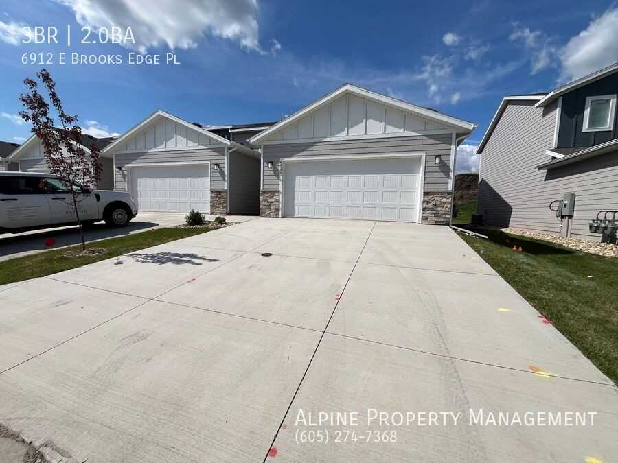 Call today to schedule a tour of this fantastic 3 Bed/2 Bath newly constructed townhome for rent on the east side at 6912 E. Brooks Edge Pl in Sioux Falls! Conveniently located near Fred Assam Elementary and Willow Run Golf Course. The multiple amenities and warm inviting finishes are a perfect blend of classic and modern to make this new construction feel right at home. Your main level features an open concept living room/kitchen/dining area perfect for hosting with all stainless steel appliances in the kitchen and a breakfast bar for extra seating! The living room has large sliding glass doors to your walk-out patio and vaulted ceilings above making it feel extremely expansive. The master bedroom is on the main level as well and includes an attached walk-in shower and roomy walk-in closet. Upstairs you will find 2 more adequately sized guest bedrooms, a second living area that overlooks the main level, a full guest bath with tub shower, and your laundry hookups. Central heat/air and a two car attached garage also included in all units! (Washer/dryer can also be provided for an additional $50/month.) - $50 application fee per adult - $2045 security deposit - Tenants are responsible for gas, electric, water - Garbage, lawn/snow care included with rent! - Pet friendly (1 max under 50lbs or 2 max under 25lbs) and non-smoking - - Alpine Benefits Package included for $25/month extra (see website for full details) Professionally leased and managed by Alpine Property Management 2nd Floor Loft Living Area Attached Two Car Garage Back Patio Brand New Construction Central Heat/Air End Unit Garbage Garbage/Lawn/Snow Included With Rent!! Laundry Hookups Lawn And Snow Care Main Level Master Suite Non Smoking Online Tenant Portal Pet Friendly (1 Max Under 50lbs Or 2 Max Under 25lbs) Walk In Closets Walk In Pantry