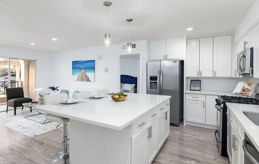 Single level end unit located in one of the best locations in the desirable La Costa Alta community! This fully renovated home offers full size in-unit laundry, open concept living space, AC/central heat, two storage units, XL bedroom with a walk in closet, and low HOA dues. The renovation includes white shaker cabinets with a large island, extra storage, quartz counters w/ a custom built in desk area, deep kitchen sink, stainless steel appliances, overhead recessed lighting throughout, laminate flooring, upgraded baseboards, and fresh paint! Low HOA fee includes water, trash, sewer, 24 hour security, pool, spa, and gym. The outdoor space includes a nice sized patio with a storage unit, assigned parking spot located close by, and plenty of guest parking.