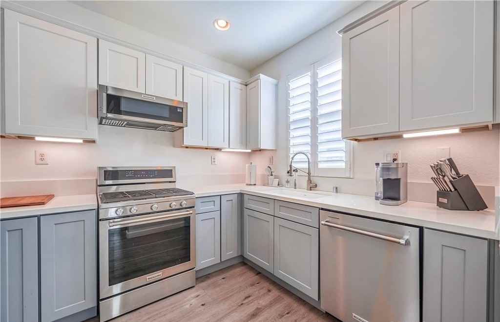 Talk about LOCATION! Look no further! Welcome home to this lovely, beautifully upgraded 1 bedroom 1.5 bath condominium in the tranquil resort like community at the Artisan in Chino. As you make your way into the main living level, you are warmly invited by an open living space, luxury vinyl plank flooring, plantation shutters, a new ceiling fan, new light fixture in the dining area along with a balcony to enjoy your morning cup of coffee. The kitchen has meticulously been fully renovated, complete with new stainless steel KitchenAid appliances (refrigerator include), white quartz countertops, soft closing cabinets and drawers, recessed lighting and a Kohler farmers sink. Make your way upstairs, you will find a conveniently tucked office space. Continue to the generously sized bedroom with French doors that open up to spectacular views of the mountains from your bed. The spacious primary bath is complete with a double vanity, a stand up shower and a separate tub, and not to mention a walk-in closet. Other upgrades include a new tankless water heater, a new vanity sink in the main level bathroom, and new toilets in both bathrooms. This community offers resort like amenities such as 2 swimming pools and a gym along with a playground for your little ones. This prime location is close to the 60 fwy and a short drive to plenty of shopping and restaurants.