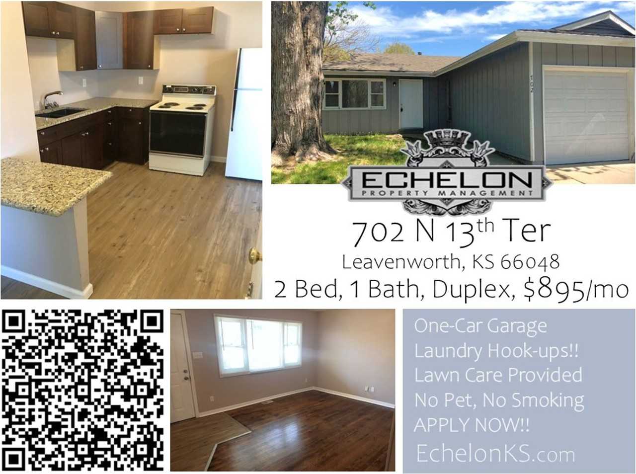 WON'T LAST!! Ranch-style Duplex. Kitchen features updated cabinets and countertops, and a Dining nook. Hardwood floor in the Living Room!! Two bedrooms, one bathroom with laundry hook-ups and an attached, one-car garage. Lawn Care Provided!! No Pet. No Smoking. Minutes from Fort Leavenworth, Lansing, University of Saint Mary, and Greater Kansas City Area!! Showing Properties for Applicants Only. Apply NOW!! EchelonKS. com Professionally managed by Echelon Property Management, 913-705-0201. Rental qualifications: Credit score of at least 600, no evictions within the past 7 years, at least 90 days verifiable income, household income of at least 3 times the rent, at least 18 years of age.