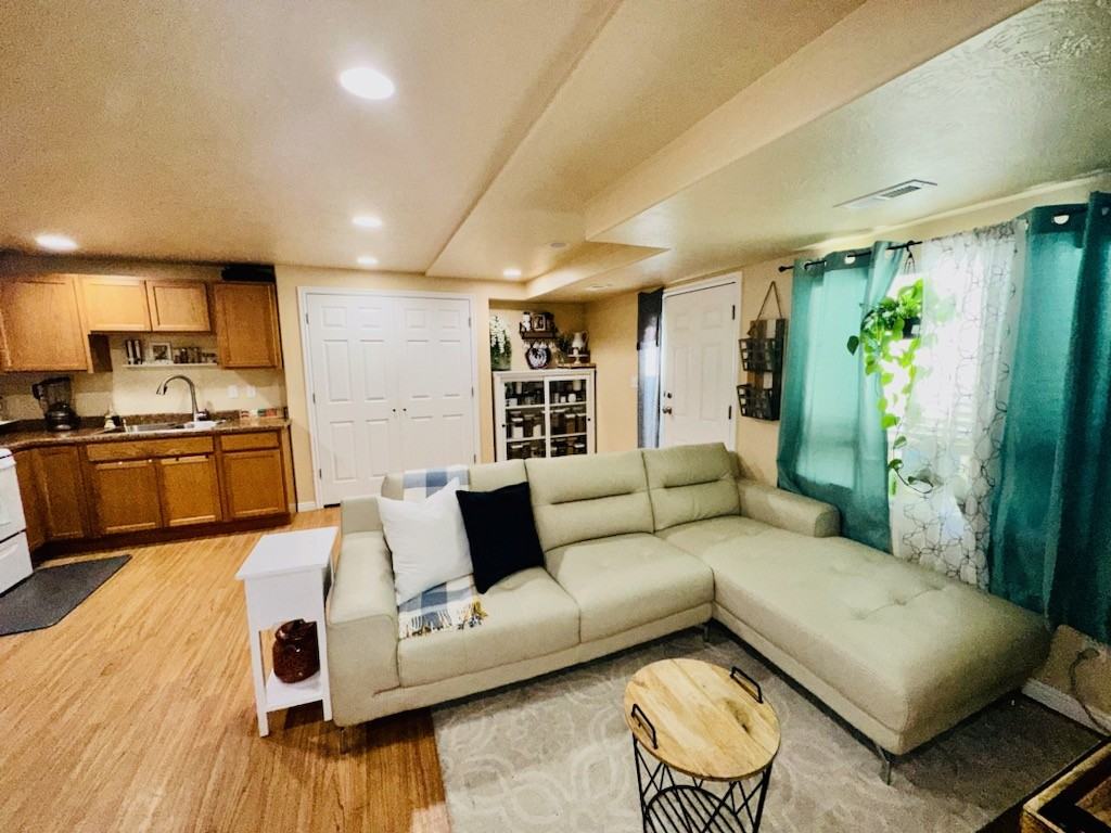 This spacious basement apartment with a separate entrance has two bedrooms as well as one bonus room ( previous tenants have used this as a sewing room extra living space, and a makeup room). The living and kitchen are open-flow spaces, with multiple storage options. Washer and Dryer hookups are available- you get one spot in the garage. This property is right off of 7200 West and 201, which is a 30* minute commute to downtown or the university (*give or take). Close to Moutain View and around 30* minutes to Herriman(*give or take). It is located in an up-and-coming area, close to many shopping, dining, and entertainment options. Friendly and quiet neighborhood the local elementary is Gerald Wright, the Middle school is Matheson, and the High School is Cyprus High. There are a lot of local pathways and parks to enjoy. There is a set price of $150 for utilities, total price is $1350 which includes utilities and wifi internet. This pricing is for your basic two-adult household, there will be an additional $50 charge for each added adult staying at the house for more than one week.